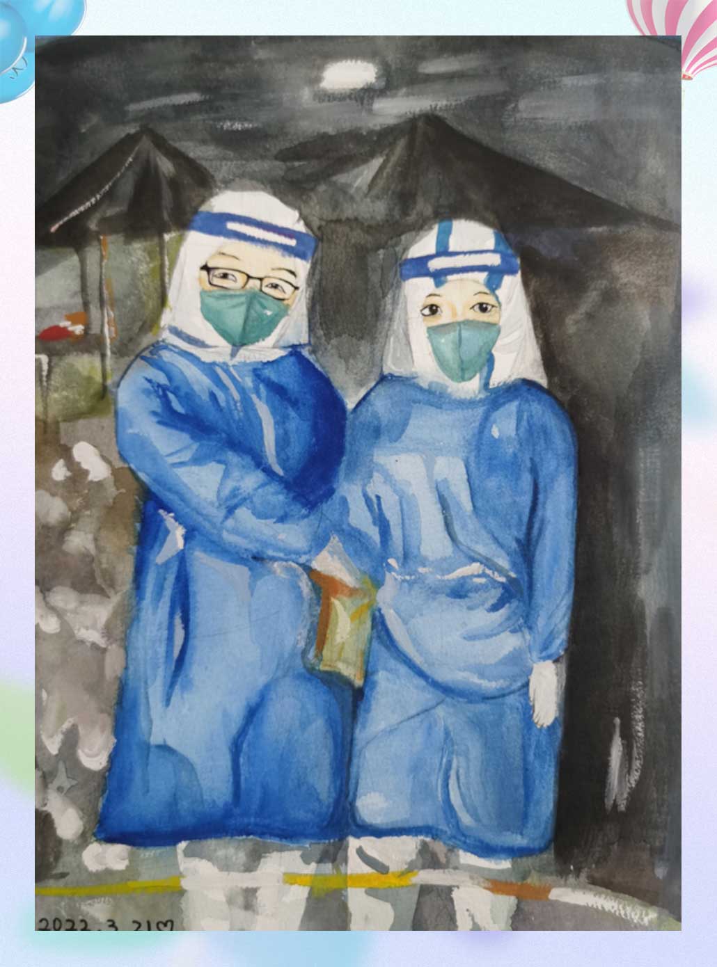 Painter's word: I used paper and color pencils to make a mask and named it ""Frontline against the epidemic", to express my admiration and praise for frontline anti-epidemic workers, as well as my wish to root for Shanghai's fight against the epidemic and guard our beautiful home.