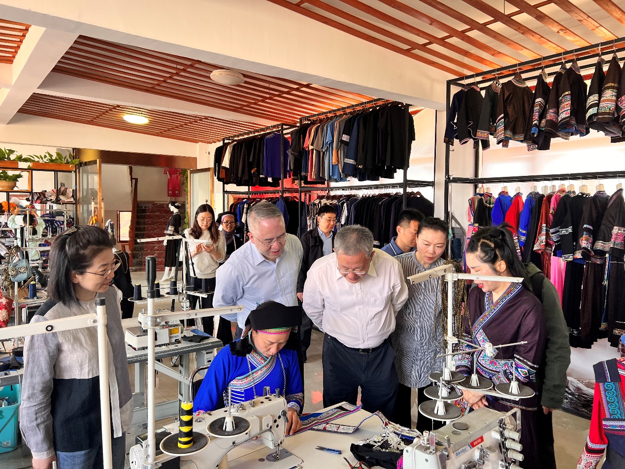 On the morning of March 25, Yu and his team visited an intangible cultural heritage workshop in Qiubei, learning about Qiubei's rich intangible cultural resources and the results of the cultural heritage site visits in the previous years, and observing the production process of embroiderers in the workshop. Based on the "double-hundred" paired support action, SSAM launched the "Charity · Heritage" cultural heritage program in 2019, and has visited and reported five intangible cultural heritage sites in Qiubei, covering items such as spinning & weaving, bamboo umbrella and string dance since. The program helped locals obtain the status of intangible cultural heritage workshop, the only of its kind in Qiubei, in September 2022, boosting cultural confidence, generating internal dynamism, transforming "the power of fingertip" into the power of revitalization, and making the development results of the intangible cultural heritage workshop benefit the people more.