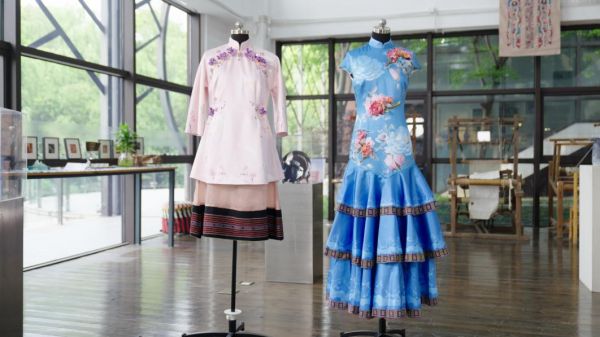 说做就做。很快,上海大学上海美院的设计团队就创作出两件新中式礼服作品。“我们对传统的非遗进行了一系列创新,用上海的绒线编结技艺制作了立体的玉兰花,佤族织锦提取了其中的图案,这些纹样都展现出人民对美好生活的向往。”学院时尚非遗设计师宋天颐介绍道,“在色彩上,我们结合了当季的流行色,进行了再设计、再创造。值得一提的是,礼服面料上的数字喷绘是使用AI生成的。”